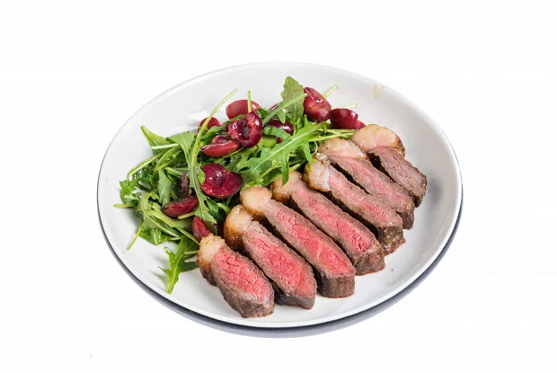 ШАГ 6 Смешать руколу с заправкой, стейк нарезать ломтиками, выложить на тарелку, рядом руколу и маринованную черешню.