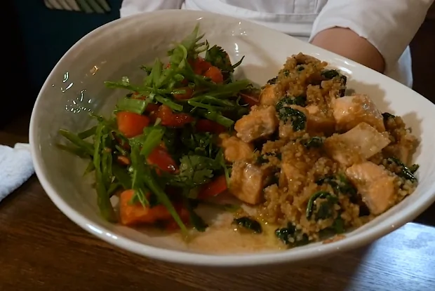 ШАГ 2 Обжарить в течение 3 минут рыбу. Затем добавить предварительно замоченный булгур, шпинат и соевый соус. Посолить по вкусу. Обжаривать еще в течение 3 минут.