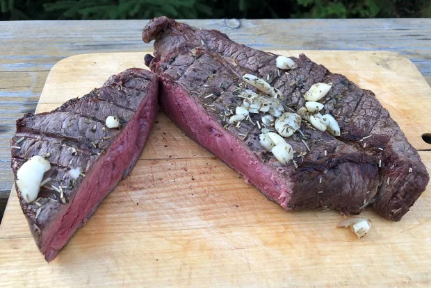 ШАГ 3 Добавить к стейкам нарезанный чеснок, розмарин (можно еще орегано или другие итальянские травы), кусочек сливочного масла; завернуть в фольгу и оставить мясо еще на 20 минут.