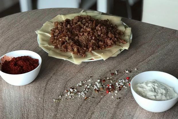 ШАГ 3 Из куска говядины сделать фарш. На золотистый лук выложить мясо в виде подушки, посолить и поперчить (2–3 щепотки), смешать и жарить до золотистой корочки.