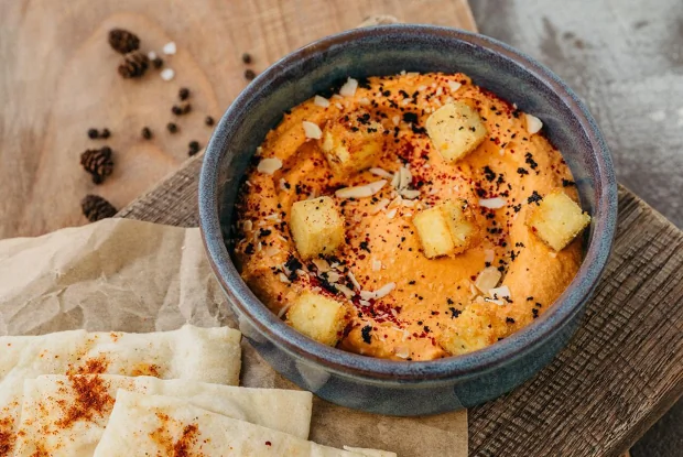 ШАГ 8 Готовый хумус выложить на тарелку, украсить запеченной тыквой, порезанной кубиками, посыпать жареным миндалем, сумахом.