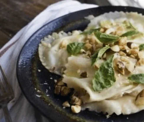 ШАГ 21 Посыпать равиоли рублеными орехами и листьями базилика.