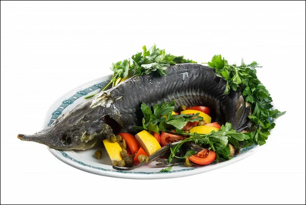 ШАГ 1 У осетра вырезать жабры и удалить внутренности, хребет надсечь в нескольких местах. Слегка посолить и поперчить рыбу внутри.