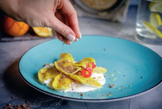 ШАГ 5 На припыленной мукой рабочей поверхности раскатать тесто в тонкий пласт, вырезать с помощью формы кружочки. На середину каждого кружочка выложить начинку, защипнуть края, придать форму вареника.