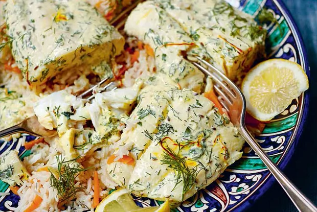 ШАГ 5 Выложить рис на большое блюдо и полить лимонным соком. Сверху выложить рыбу и полить соусом.