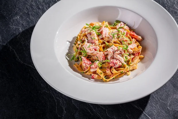 ШАГ 5 Выложить в получившийся соус пасту, икру тобико, перемешать и прогревать 2 минуты.