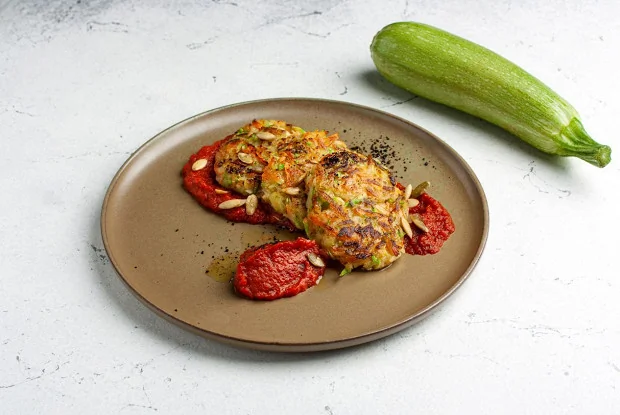 Оладьи из овощей в томатном соусе с тыквенными семечками