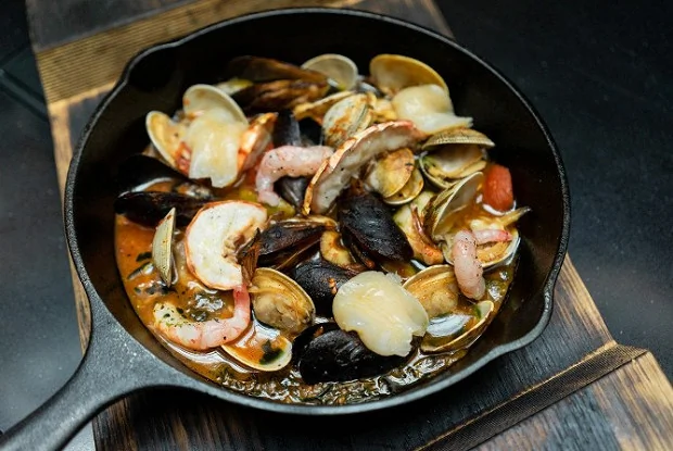 ШАГ 7 Поставить сковороду в разогретую до максимума духовку примерно на 10 минут. Следить, чтобы креветки не пересушились. Как только ракушки раскроются, соте готово, можно вынимать.