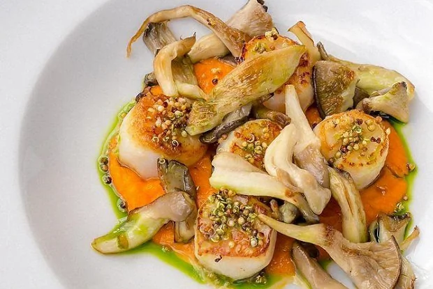 ШАГ 8 На тарелку выложить морковное пюре, посыпать обжаренной гречкой. Сверху выложить гребешки и вешенки, украсить каплями базиликового масла.