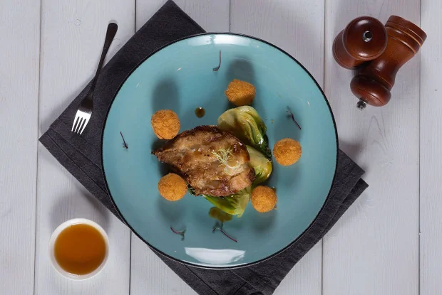 ШАГ 4 Капусту пак-чой бланшировать (ошпарить) в кипятке 30 секунд. Затем обжарить с добавлением устричного соуса. Отдельно в большом количестве растительного масла (как во фритюре) обжарить картофель до золотисто-коричневого цвета. На тарелку выложить политые соусом капусту пак-чой и рыбу, а рядом гарнир.