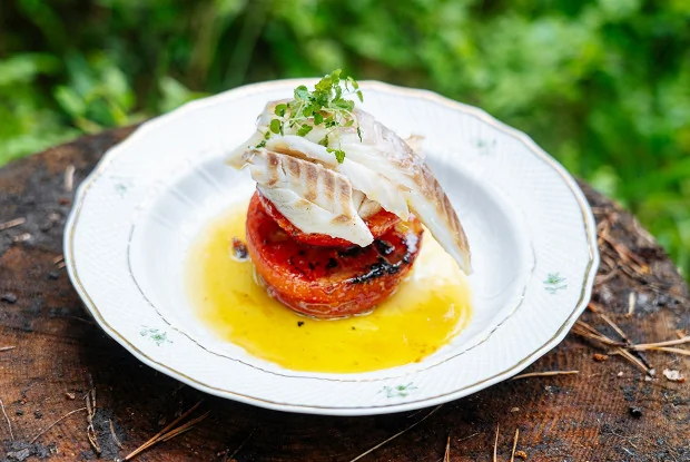 ШАГ 7 Выложить томаты на тарелку, сверху положить сегменты сибаса, заправить медово-горчичным соусом.