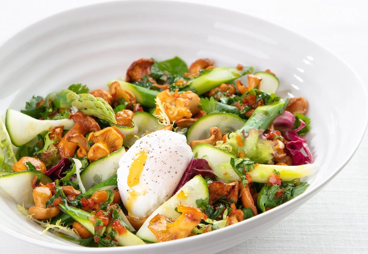 ШАГ 5 Соединить в блюде для подачи микс-салат, нарезанный тонкими кружочками цукини, спаржу, лисички. Заправить соусом, сверху выложить яйцо пашот.