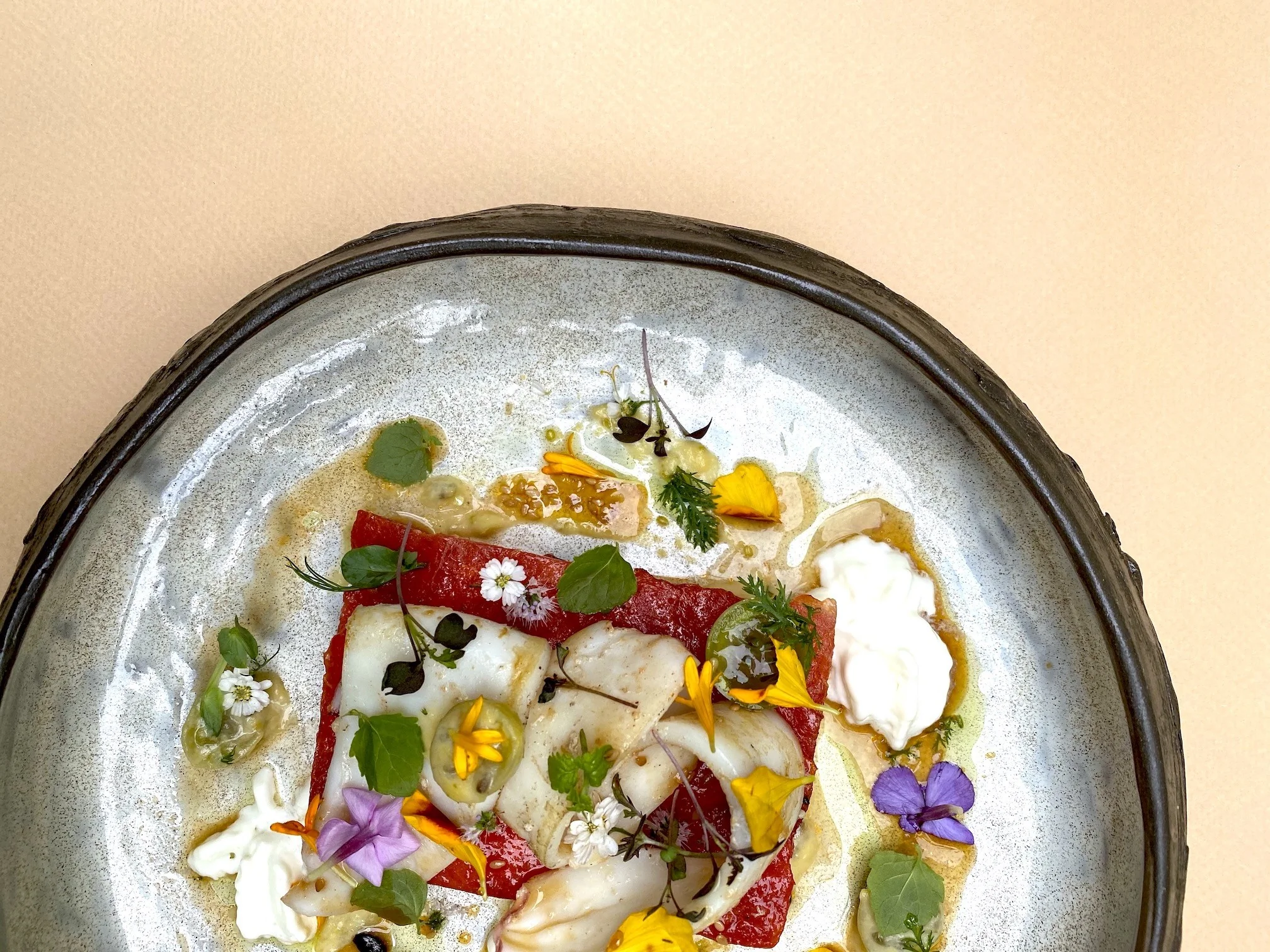 ШАГ 8 На тарелку выложить стейк из арбуза, на него — жареного кальмара. Рядом ложкой выложить сливочный сыр. Приправить вареньем из крыжовника, украсить кресс-салатом.