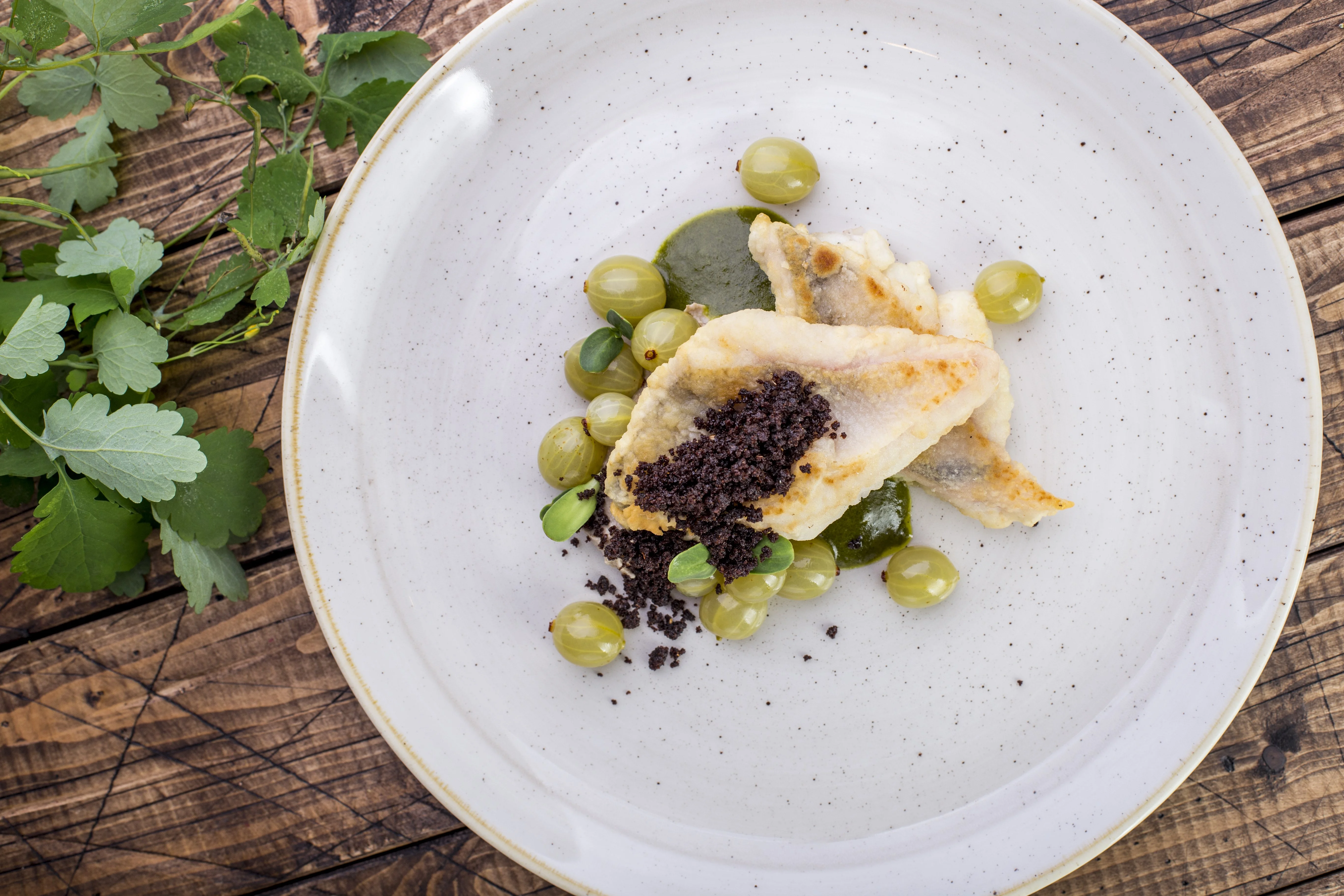 ШАГ 6 Разложить филе по тарелкам, сбрызнуть ткемали из крыжовника, рядом выложить моченые ягоды крыжовника. Посыпать рыбу крошкой из бородинского хлеба, украсить зеленью и подавать.