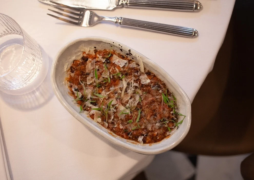Рагу из зеленой чечевицы, которая, в отличие от чечевицы всех других цветов, не разваривается в кашу, а сохраняет текстуру, зернышко к зернышку, и при этом дает рагу плотную основу. У самой чечевицы очень интересный вкус — в нем что-то есть и от орехов, и от мяса. Нам остается его только освежить и подкислить при помощи фенхеля и помидоров.