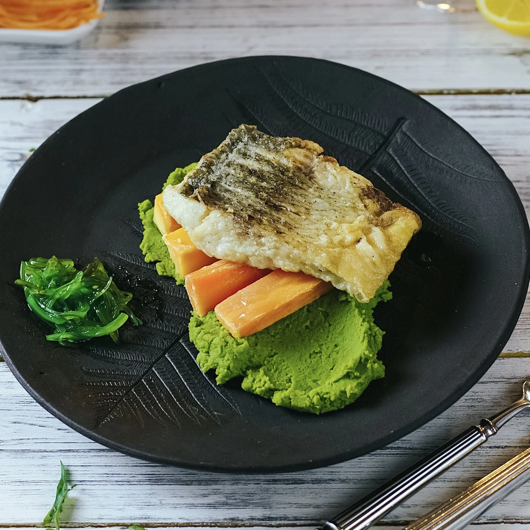 ШАГ 5 Выложить гороховое пюре на тарелку, рядом положить морковь, сверху рыбу, рядом — чуку.