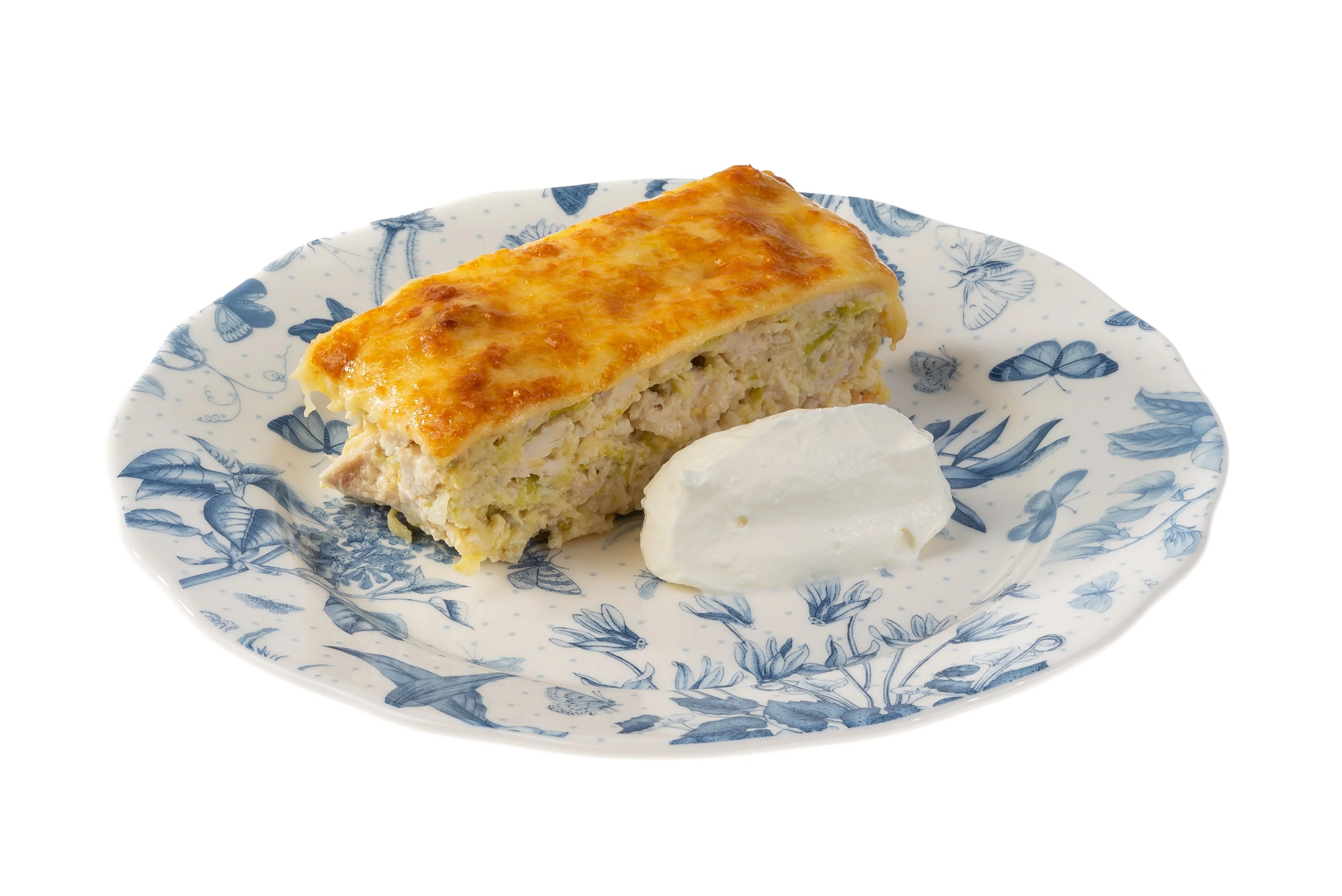 ШАГ 3 Куриное филе нарезать мелкими кубиками. Смешать с кабачками и обжаренным луком, добавить яйца, муку горчицу, сметану, лимонную цедру, соль и перец.