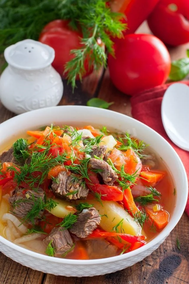 Говядина Сладкий перец Помидоры Морковь Лук Чеснок Картофель Соль Молотый черный перец Зелень главная Основные блюда