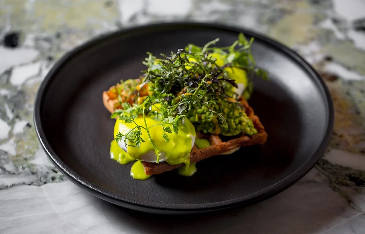 ШАГ 4 Авокадо разрезать пополам, удалить косточку, вынуть мякоть. Перец чили разрезать пополам, очистить от семян и измельчить вместе с петрушкой, добавив масло и сок целого лимона. Соединить смесь с авокадо, хорошенько размяв в эластичное, но не гомогенное пюре, в нем должны чувствоваться кусочки. На тарелку выложить вафлю, на нее — яйца, рядом — две кнели из пюре авокадо. Полить яйца голландским соусом, украсить кервелем и сбрызнуть оливковым маслом.
