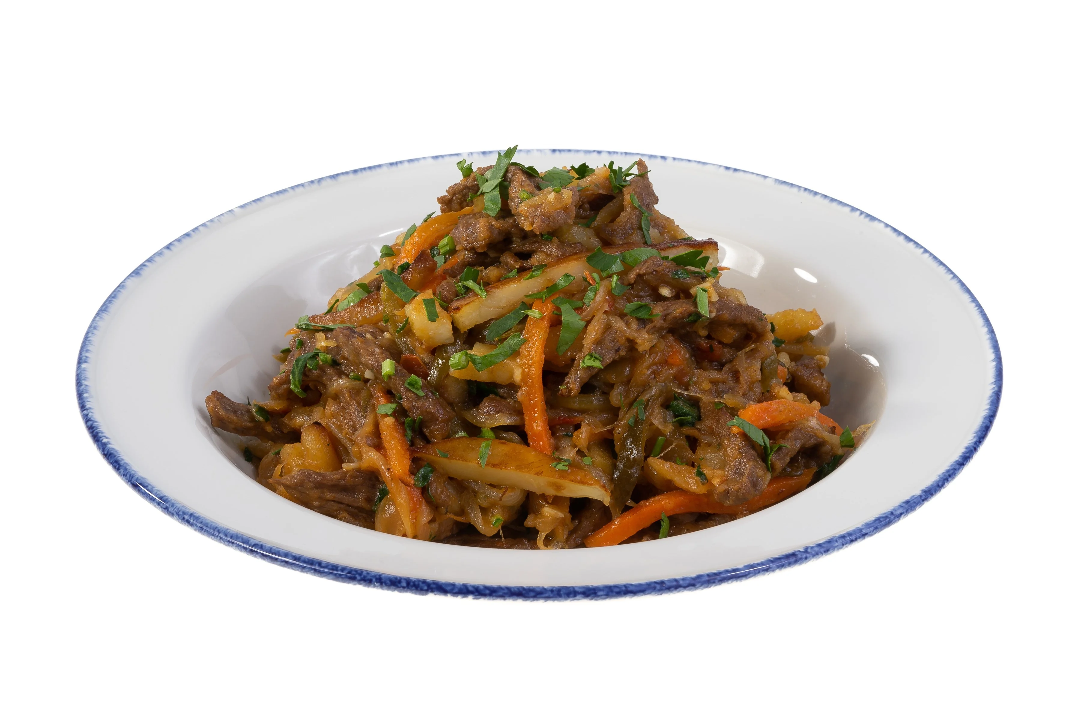 ШАГ 7 Добавить овощную зажарку к мясу, влить бульон, посолить, поперчить, накрыть крышкой и тушить 40–60 минут.
