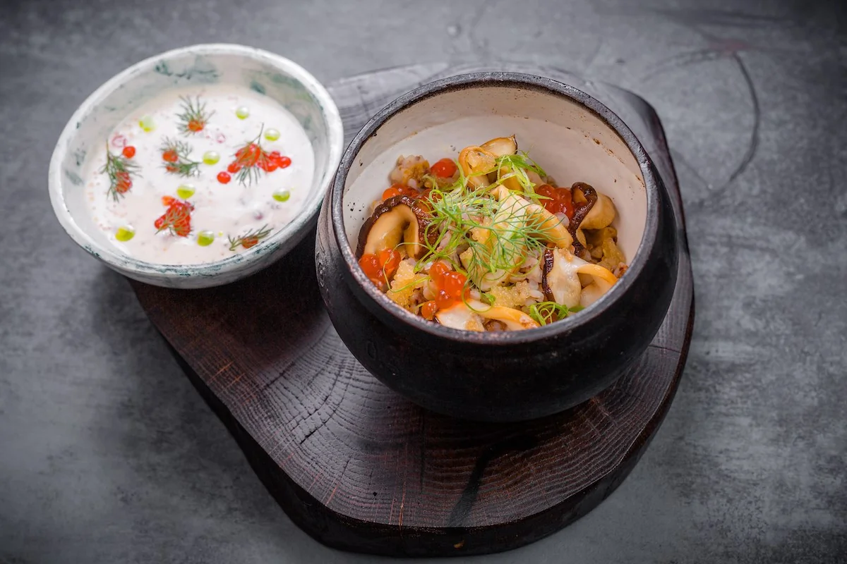 ШАГ 3 Кашу подать с добавлением обжаренных грибов и икры. Отдельно подать сметану с красной икрой.