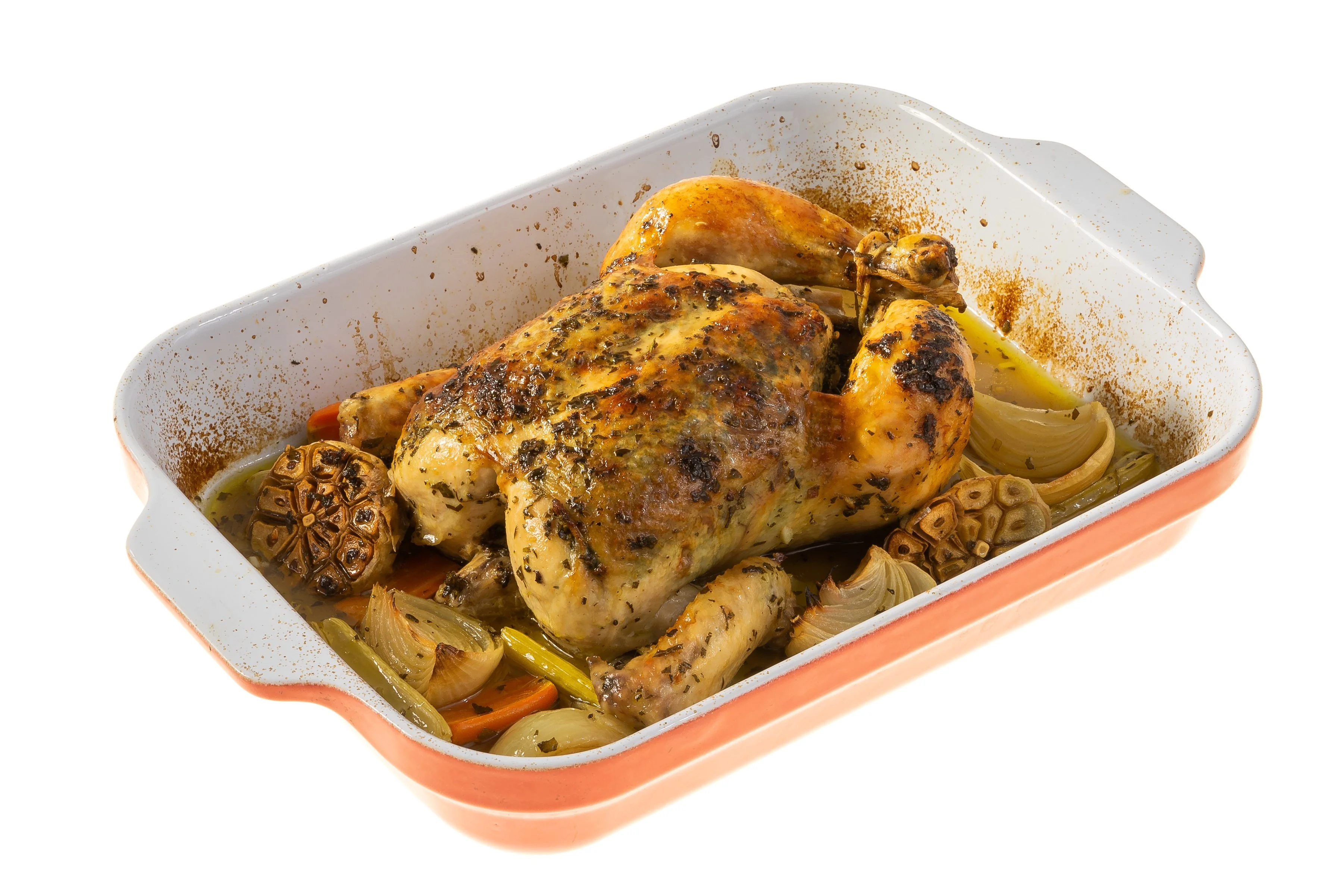 ШАГ 9 Переложить курицу в форму для запекания, рядом с ней положить разрезанную пополам головку чеснока, лук, морковь и сельдерей, влить вино. Поставить в духовку, разогретую до 180 градусов, на 45 минут.
