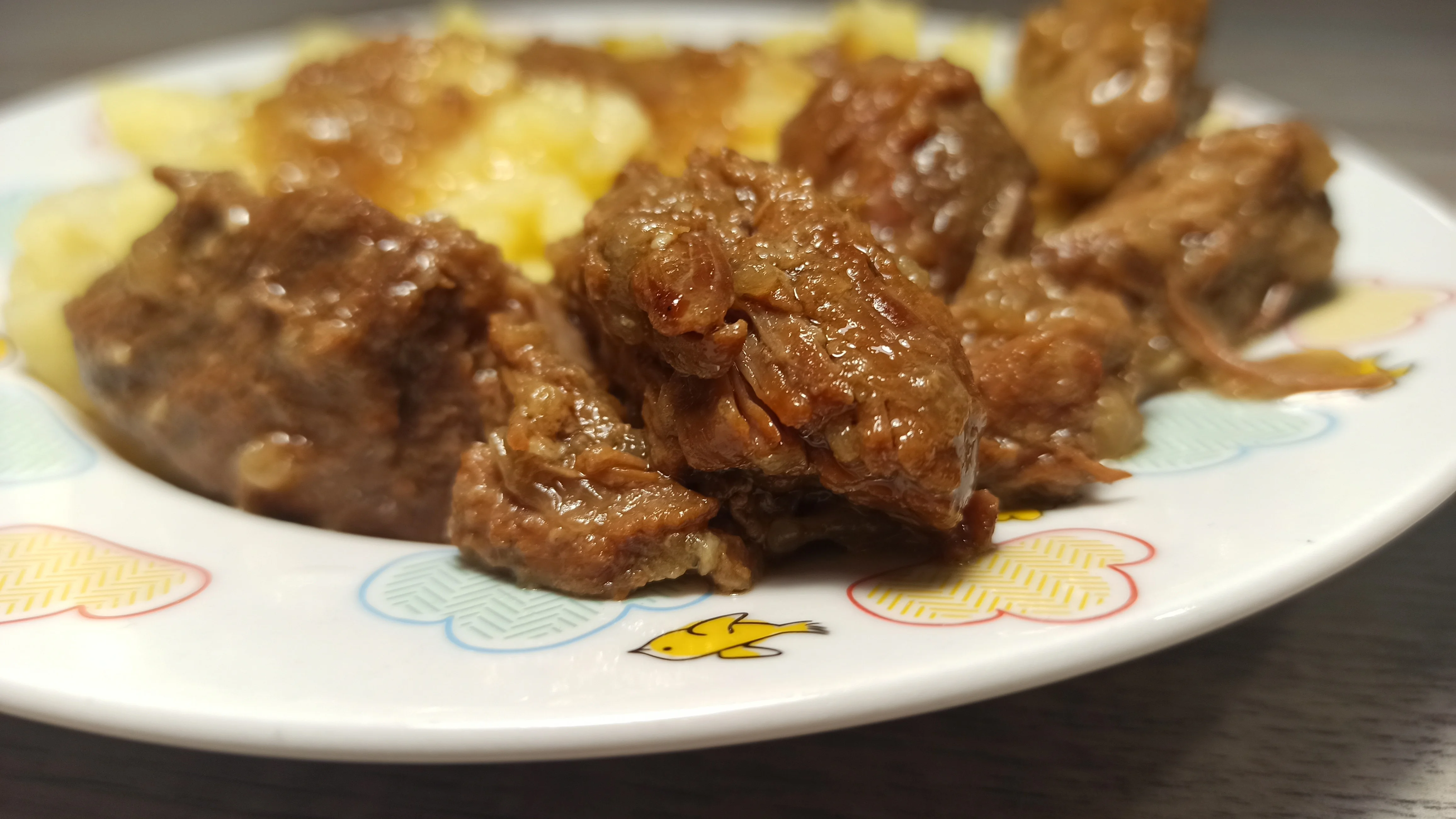 ШАГ 5 Спустя 1 час добавить к мясу соль, сахар, душистый и черный перец горошком, лавровый лист, уксус, чеснок и перемешать. Закрыть крышкой и тушить еще 1–1,5 часа, время зависит от мяса. Время от времени помешивать. По желанию можно добавить еще 50–100 мл воды, если нужно побольше подливы. Но это может не потребоваться, если сам кусок мяса был сочный, а не сухой.