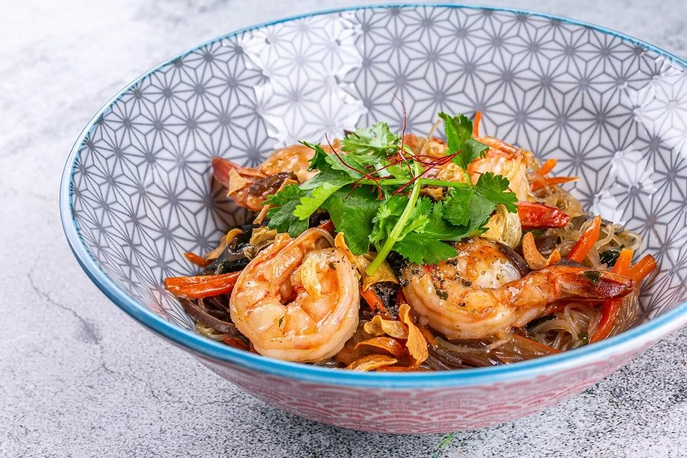 Лапша на воке с креветками, водорослями и китайским салатом