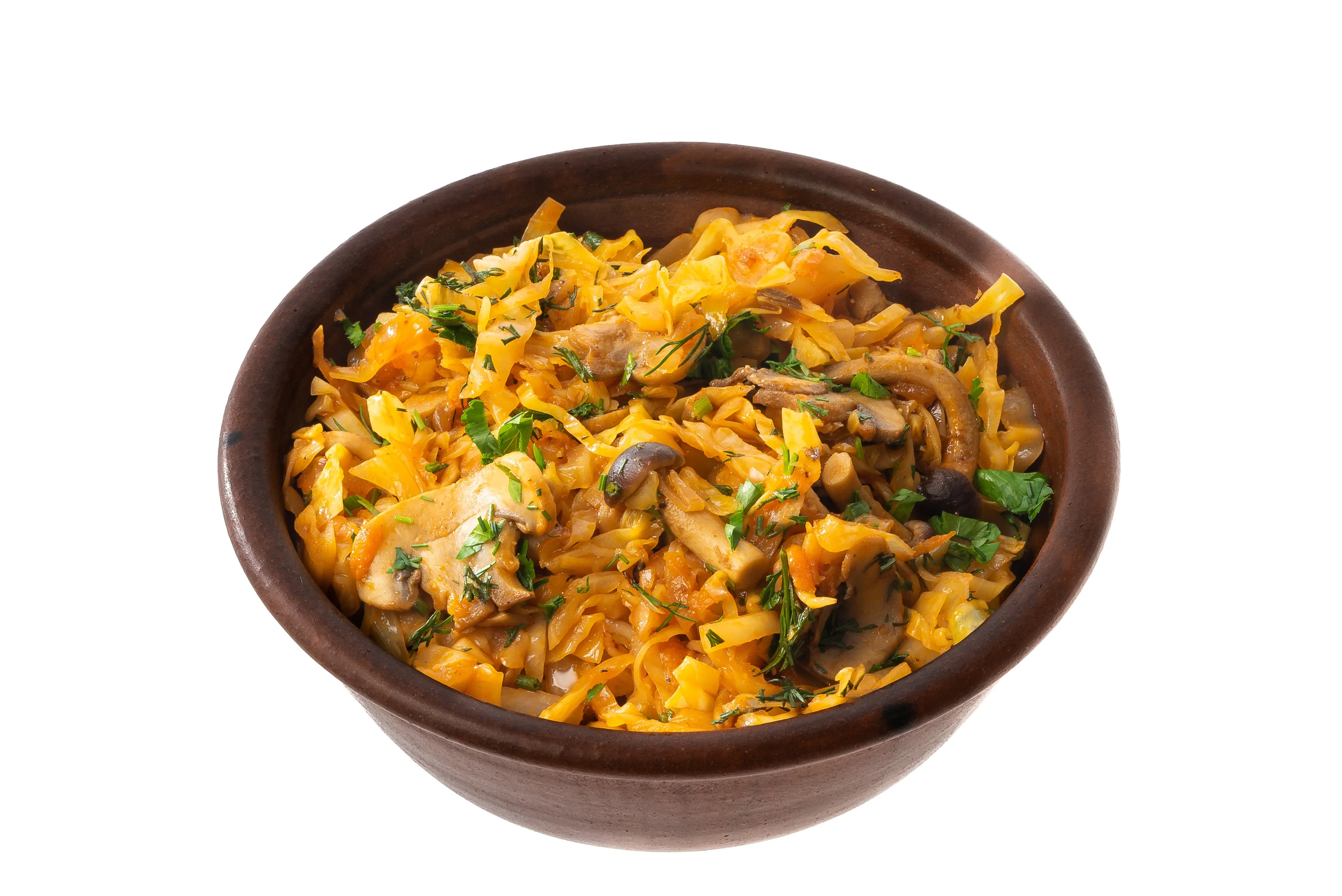 ШАГ 8 Влить томатную смесь в капусту, добавить грибы, лавровый лист, соль и перец, перемешать, накрыть крышкой и тушить 10–15 минут до желаемой мягкости капусты.