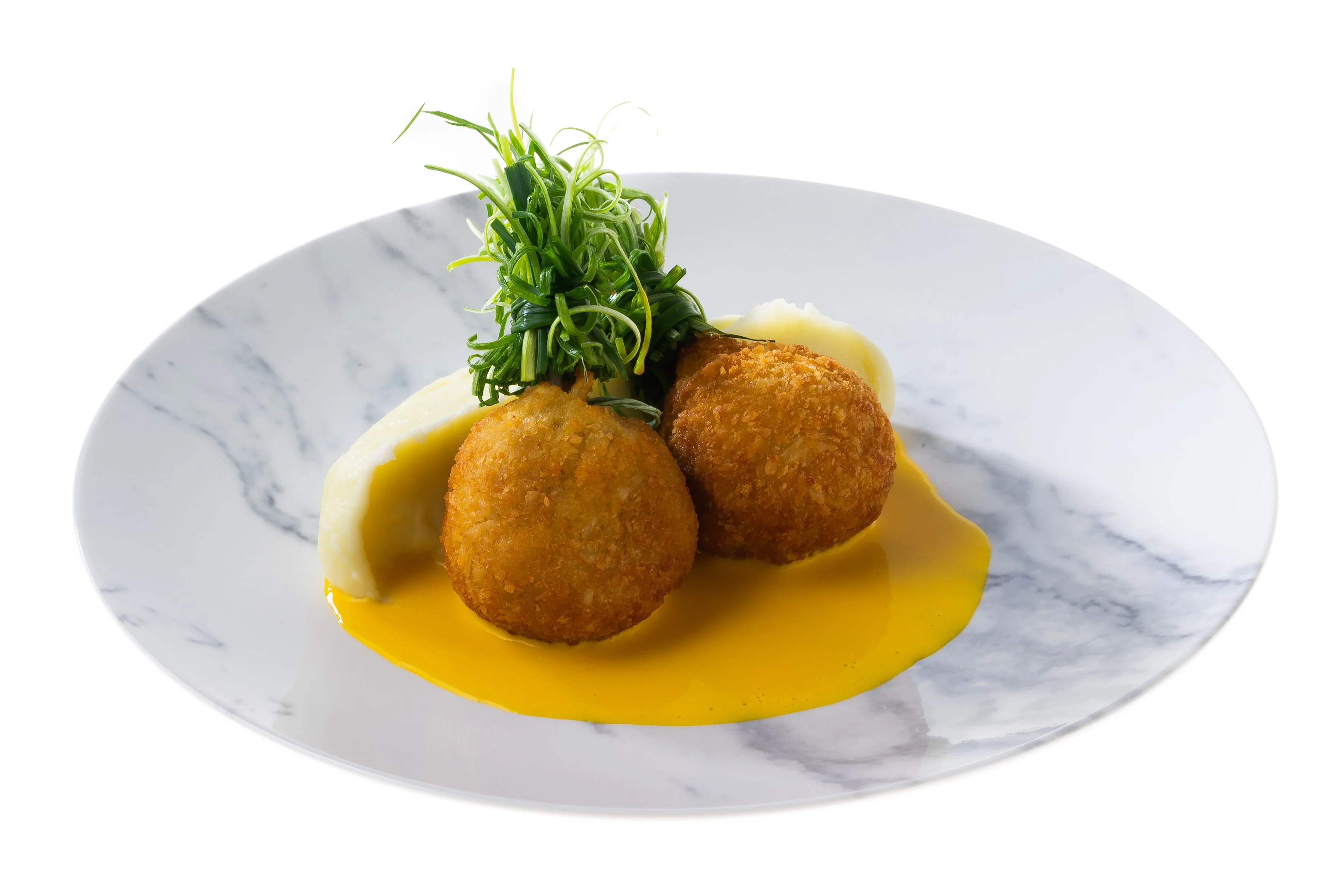 Котлеты по-киевски из перепелки с тыквенным соусом и картофельным пюре