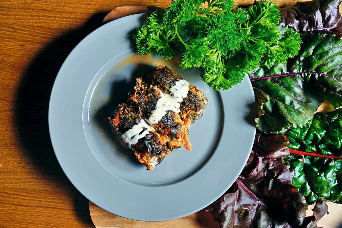 ШАГ 5 Сформовать голубцы: на 1–2 листа мангольда выложить 80 грамм фарша и завернуть. Получится тридцать — тридцать пять голубцов. Уложить на противень ровными рядами, полить сметанно-томатным соусом, посыпать прованскими травами и нарезанным чесноком.