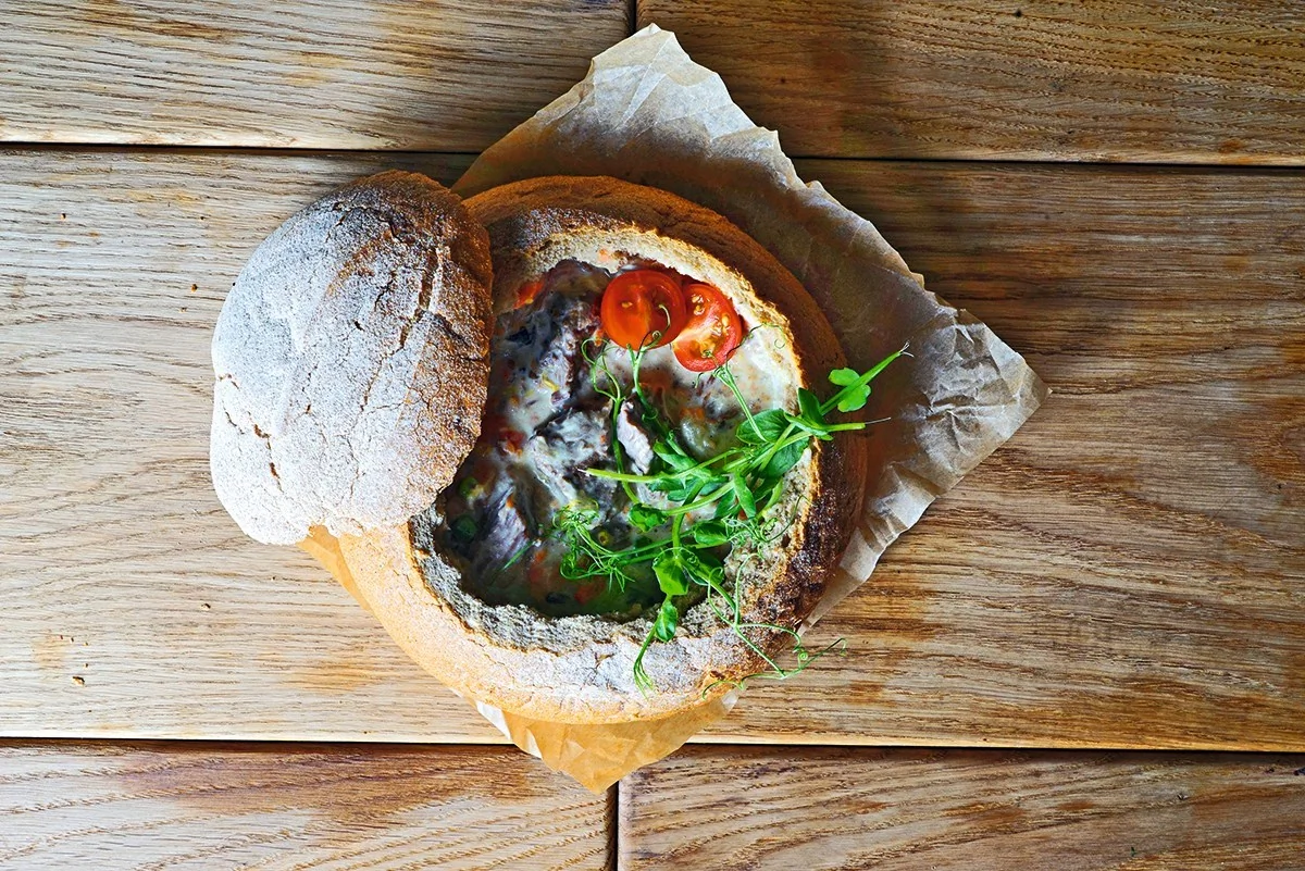 ШАГ 5 У хлеба отрезать верхушку и извлечь мякоть, она больше не понадобится, а вот срезанную верхушку хлеба нужно сохранить и использовать при подаче. Подготовленный хлеб подсушить в духовке при температуре 180 градусов в течение 5 минут до хрустящей корочки. Идеально, если хлеб будет домашний, прямо из печи.