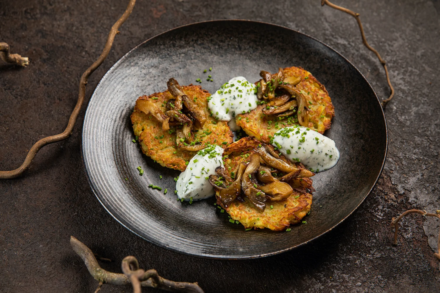 ШАГ 3 На тарелку выложить картофельные драники, сверху вешенки, украсить постной сметаной и луком-сибулетом.