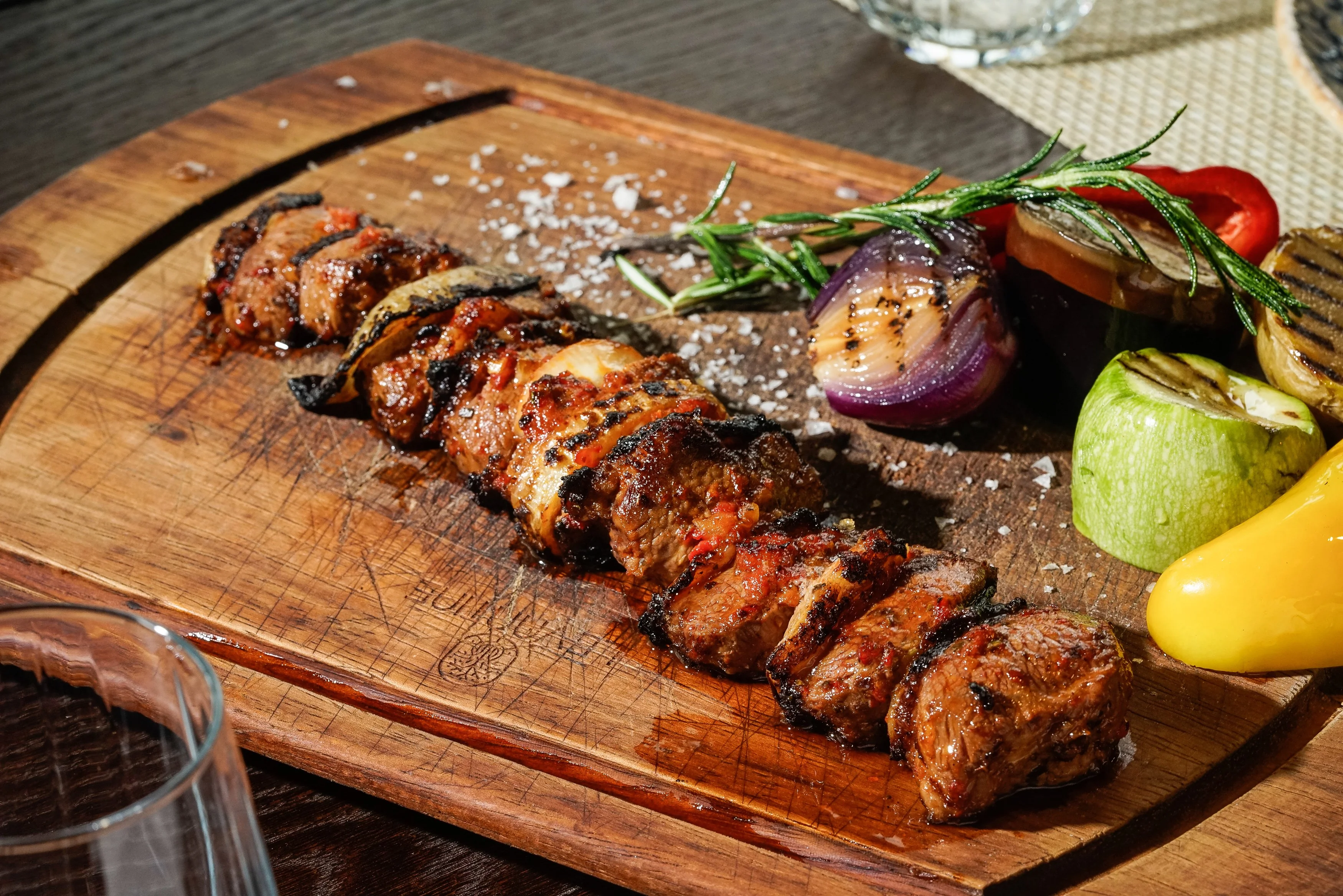 ШАГ 11 Готовить шашлык на хорошо прогоревших «седых» древесных углях. Перед тем как класть на мангал шашлык, разбить крупные угли, чтобы жар был равномерным. Обжаривать шашлык 8–10 минут, перевернув в середине приготовления. Готовность можно проверить, надрезав один из кусков: внутри мясо должно быть розоватым, но без крови. После жарки дать шашлыку постоять 5 минут, затем подавать с соленьями и зеленью.