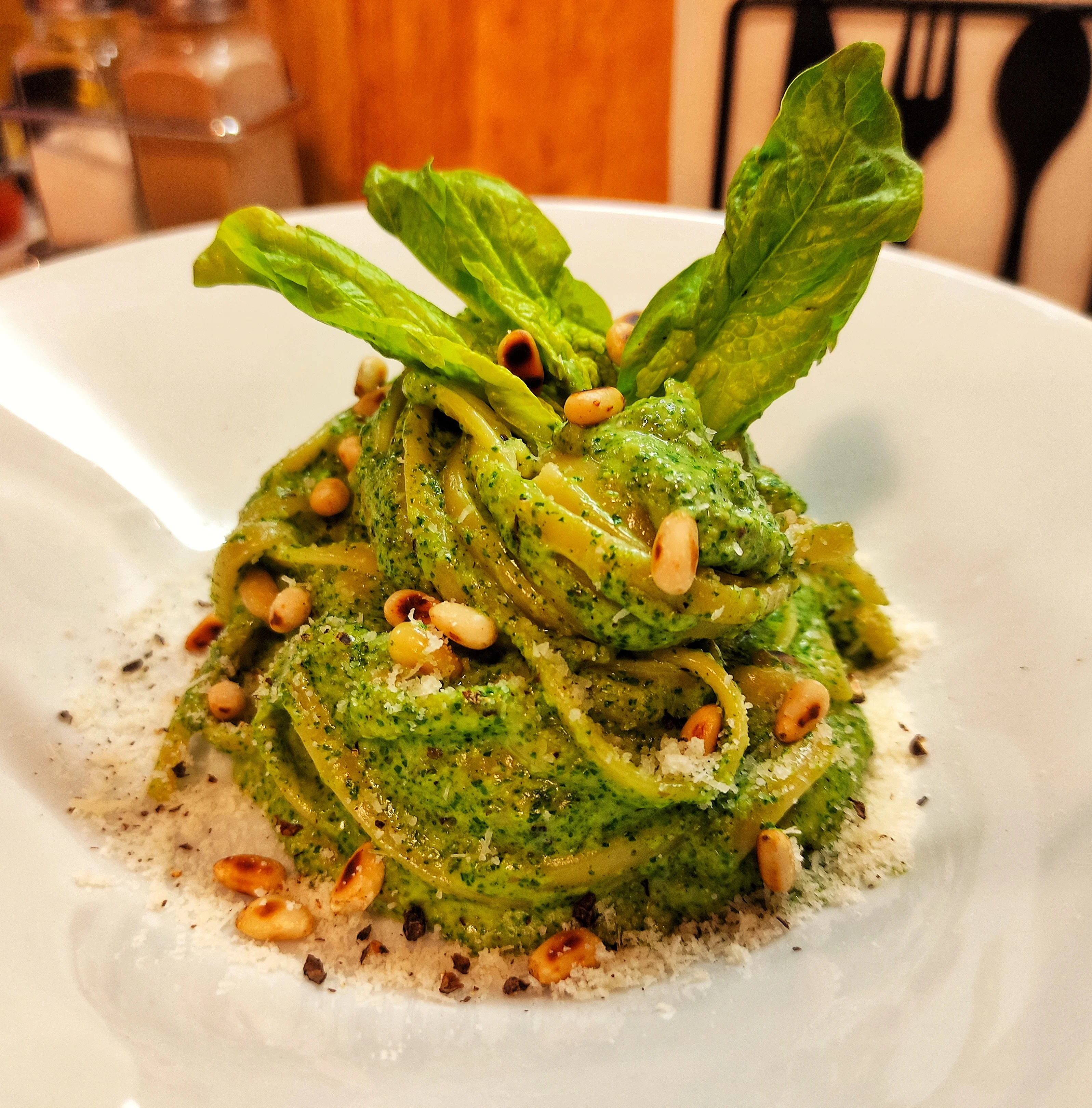 ШАГ 6 Выложить готовые спагетти на тарелку, украсить листиками шпината и оставшимися орехами, при желании посыпать сыром и молотым черным перцем.