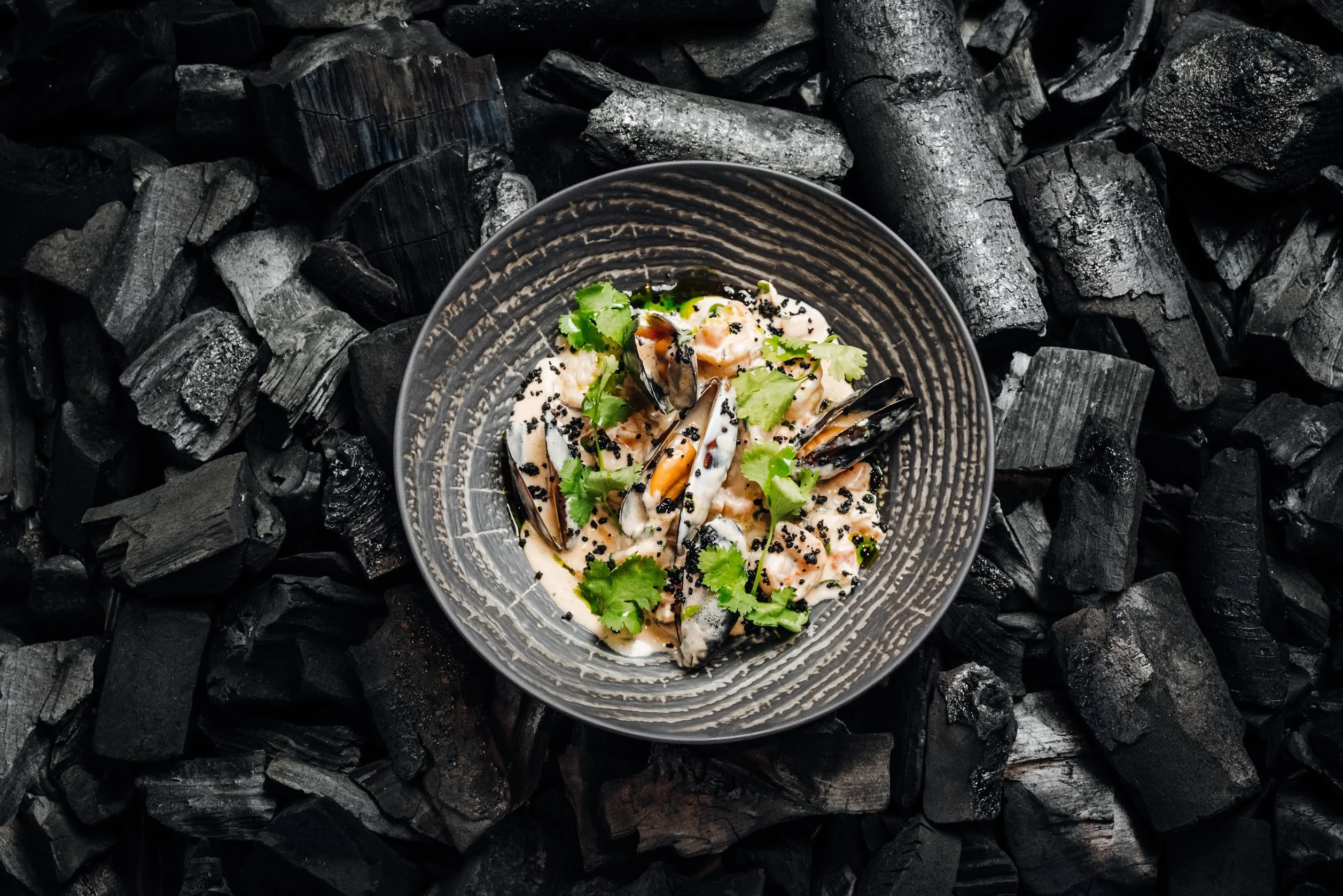 ШАГ 2 Чеснок и кинзу мелко нарубить, рыбу нарезать кусочками по 5 см, гребешок — кубиком 2×2 см, помидоры конкассе — кубиком 3×3 см. Посолить и перемешать все морепродукты.