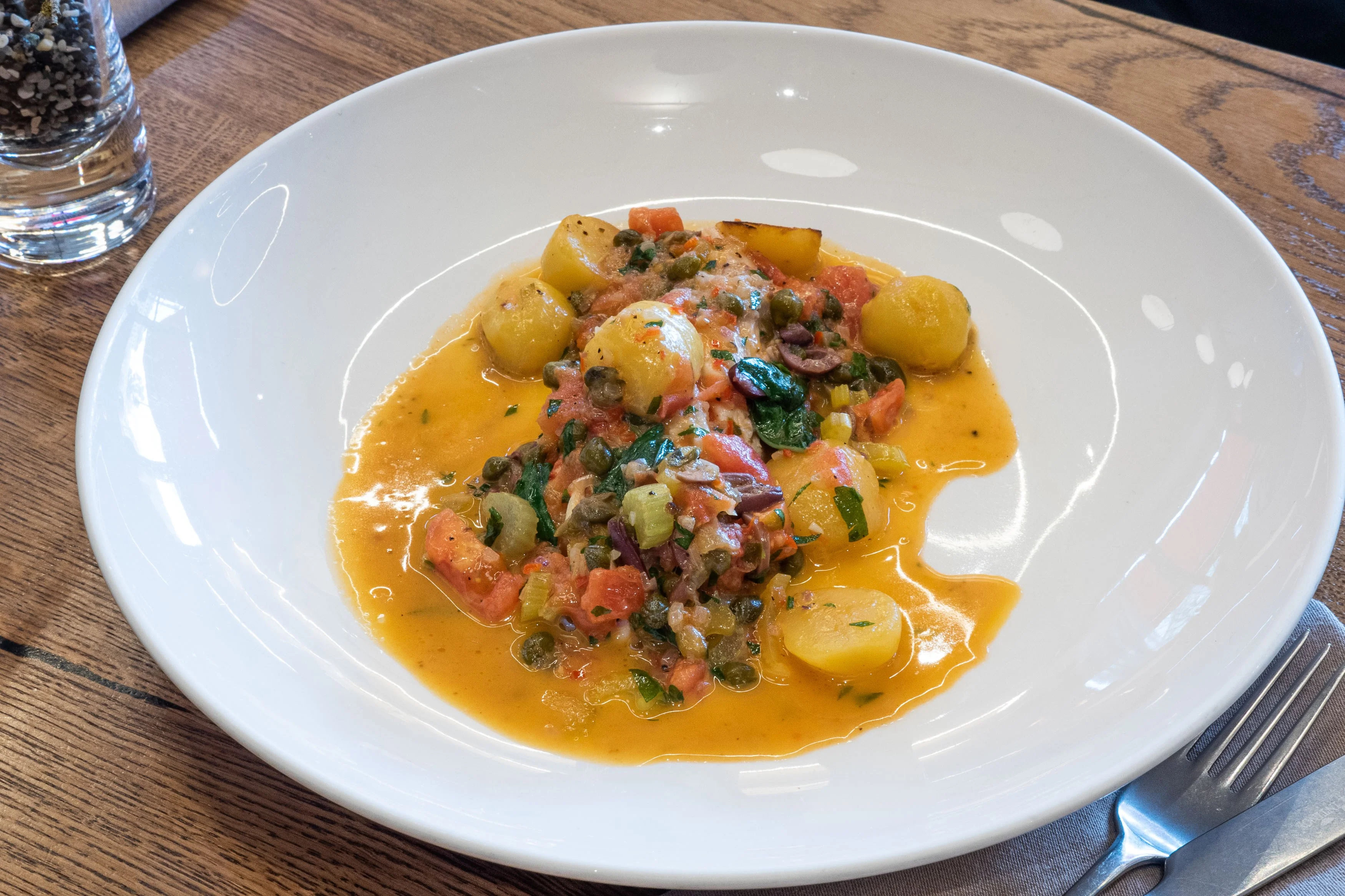 ШАГ 12 Добавить помидоры, бульон и каперсы, закинуть картофель. Довести до кипения, уменьшить огонь и тушить все вместе примерно 12 минут, до готовности картофеля. В конце посыпать рубленой петрушкой.