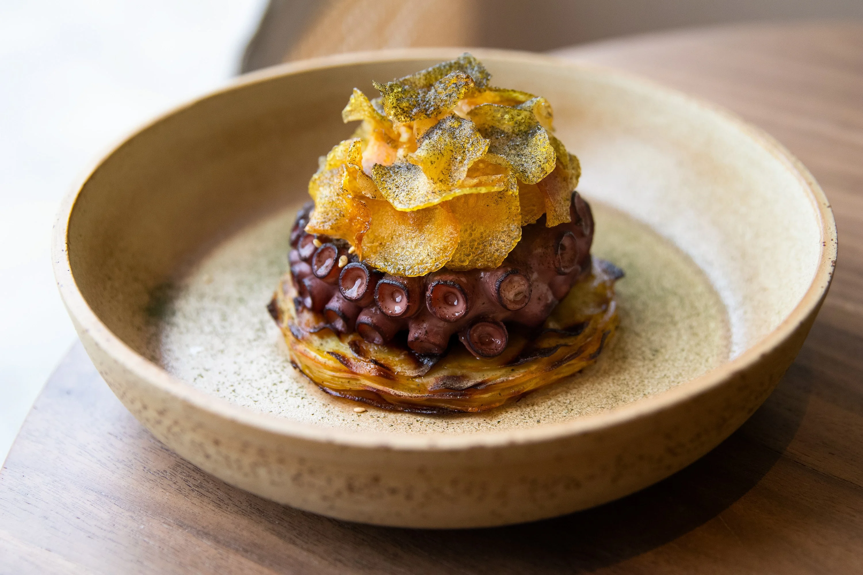 ШАГ 5 На картофельный гратен выложить луковый крем, сальсу-верде и пряного осьминога.