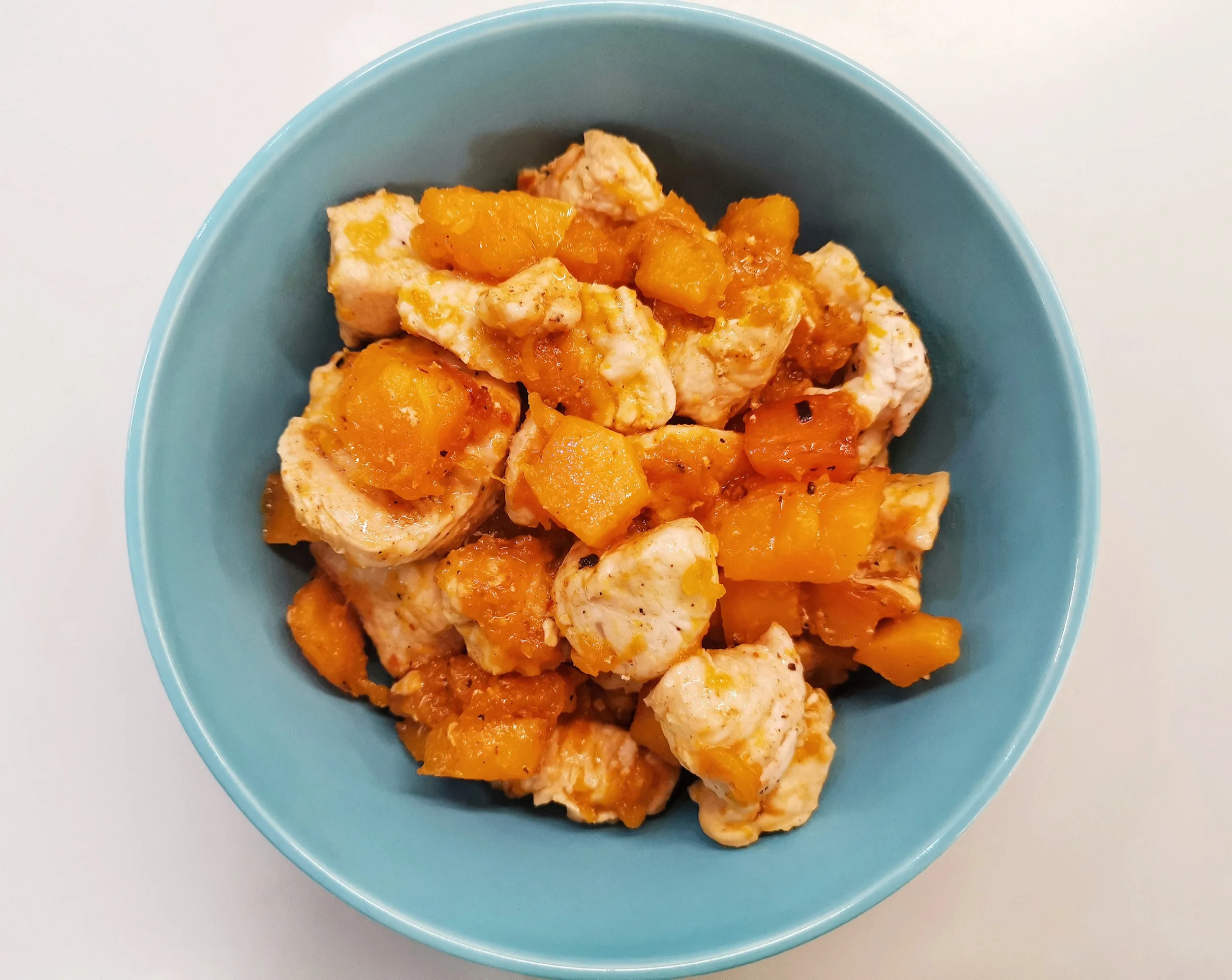 ШАГ 5 Индейку нарезать кубиками и отправить к тыкве.