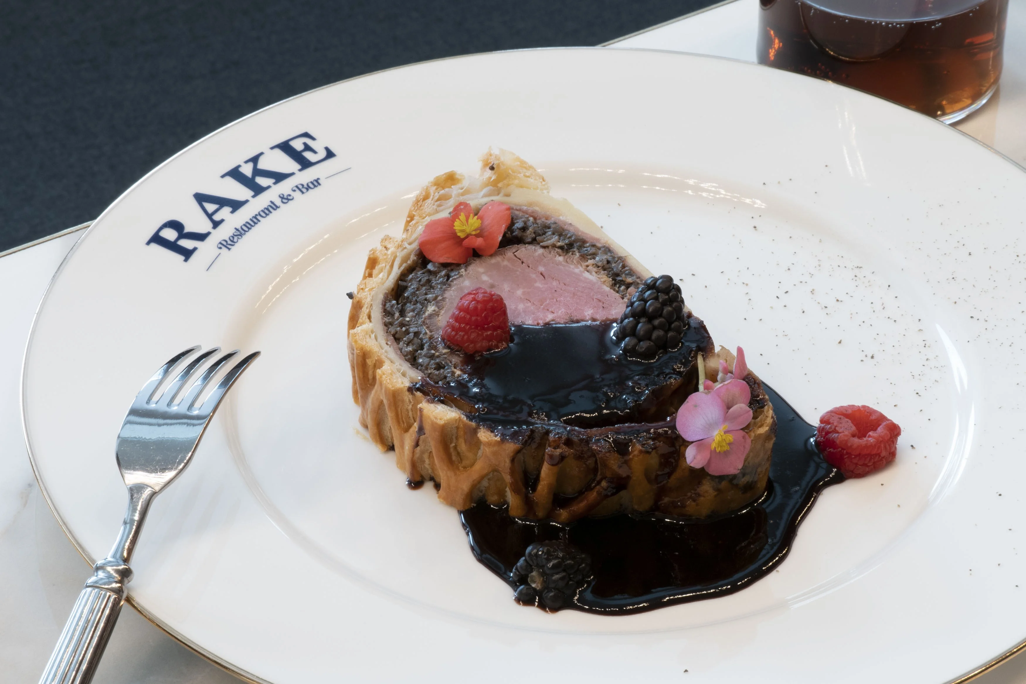 ШАГ 6 На тройной слой пищевой пленки выложить пармскую ветчину слайсами (1,5 мм толщиной), затем плотно выложить грибной дюксель, выровнять, затем положить вырезку и закатать все в рулет. Убрать в холодильник на 30 минут.
