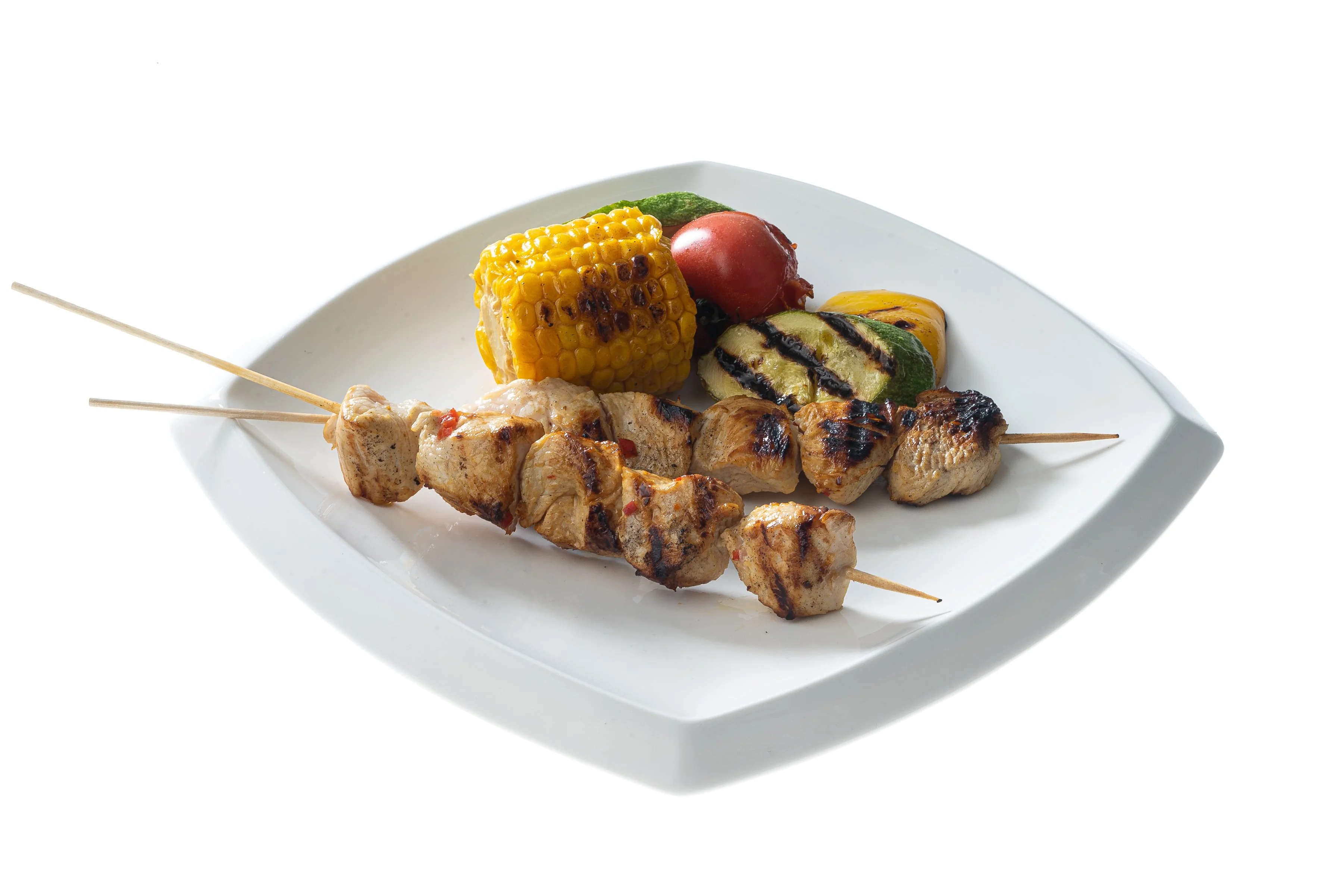 ШАГ 8 Кукурузу разрезать поперек на 4 части, кабачок нарезать кружочками толщиной 2 см и обжаривать все овощи на смазанном маслом хорошо разогретом гриле или на сковороде, время от времени переворачивая, 4–5 минут. Подавать шашлычки с овощами гриль.