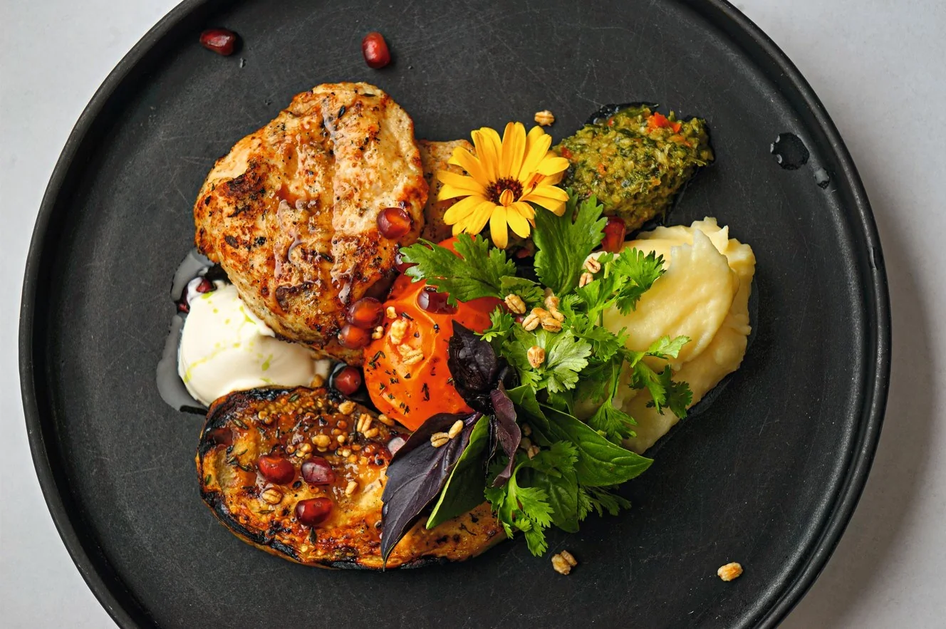 ШАГ 5 Для подачи на тарелку выложить медальоны из индейки, рядом — запеченные баклажаны и помидоры (овощи сдобрить соусом наршараб), добавить соус из трав и овощей и сметану. Украсить пряными травами и зеленью.