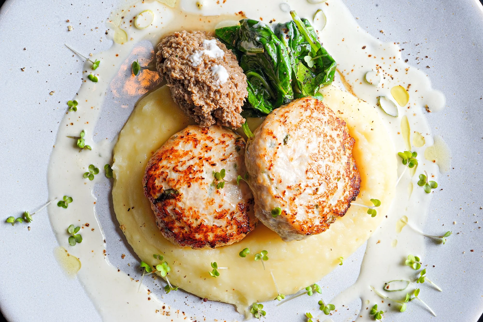 ШАГ 7 Для подачи: на тарелку выложить котлеты с картофельным пюре, шпинатом, добавить грибную икру и подавать с соусом сюпрем.