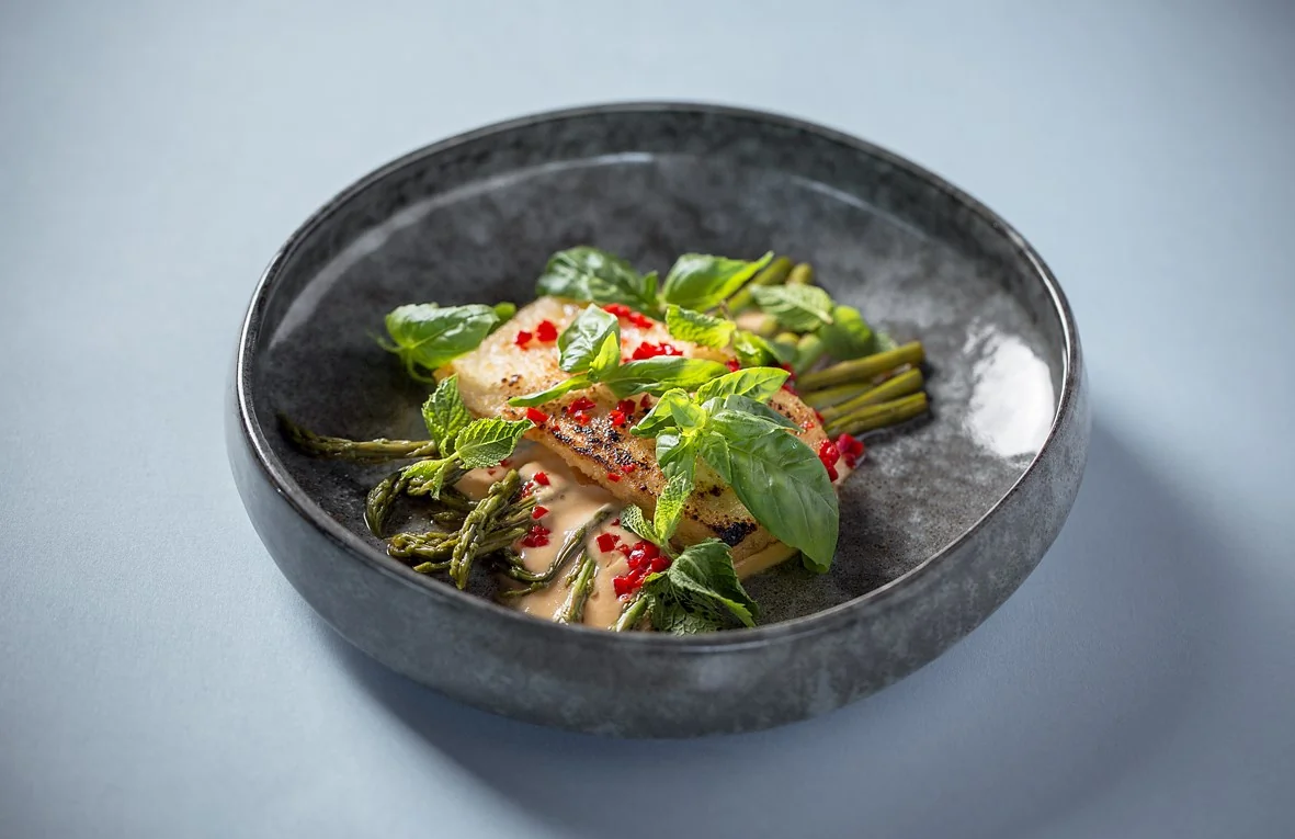 ШАГ 4 Выложить на тарелку соус, на него — маринованную спаржу, сверху — тофу. Посыпать мелко рубленным перцем чили и украсить листьями базилика.