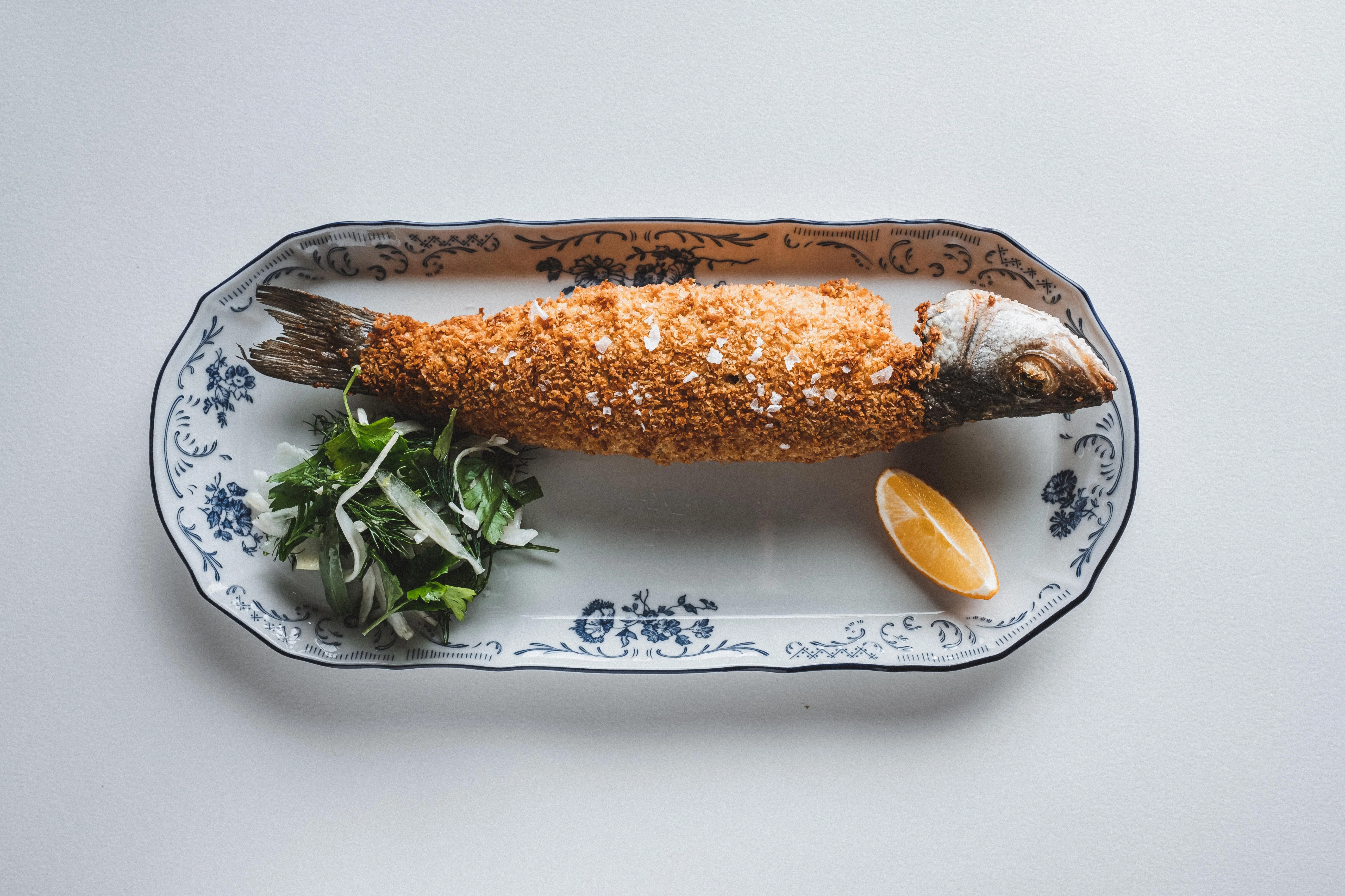 ШАГ 9 Вынуть из рыбы шпажки. Подавать с ломтиком лимона и салатом из трав и фенхеля.