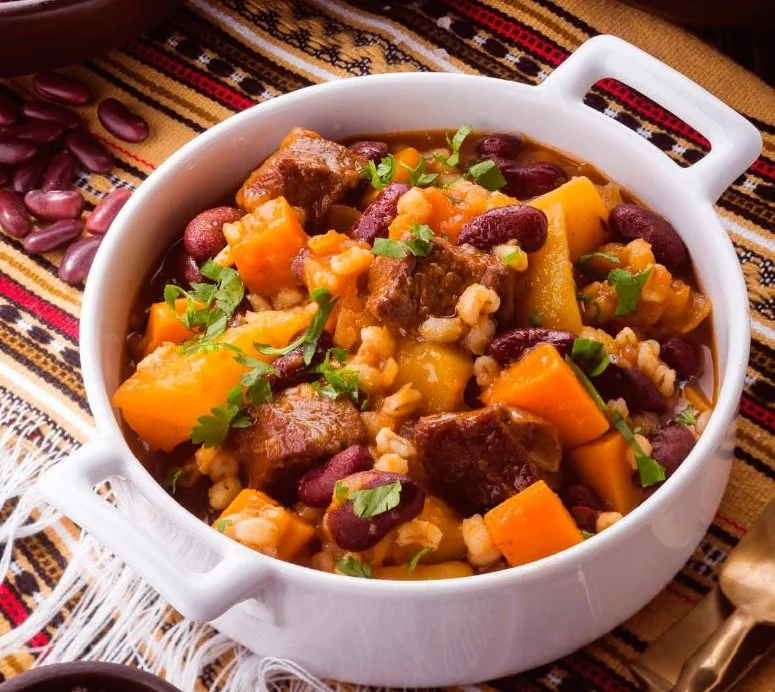 ШАГ 6 Незадолго до окончания тушения добавить фасоль, перловку и специи. При подаче посыпать зеленью.