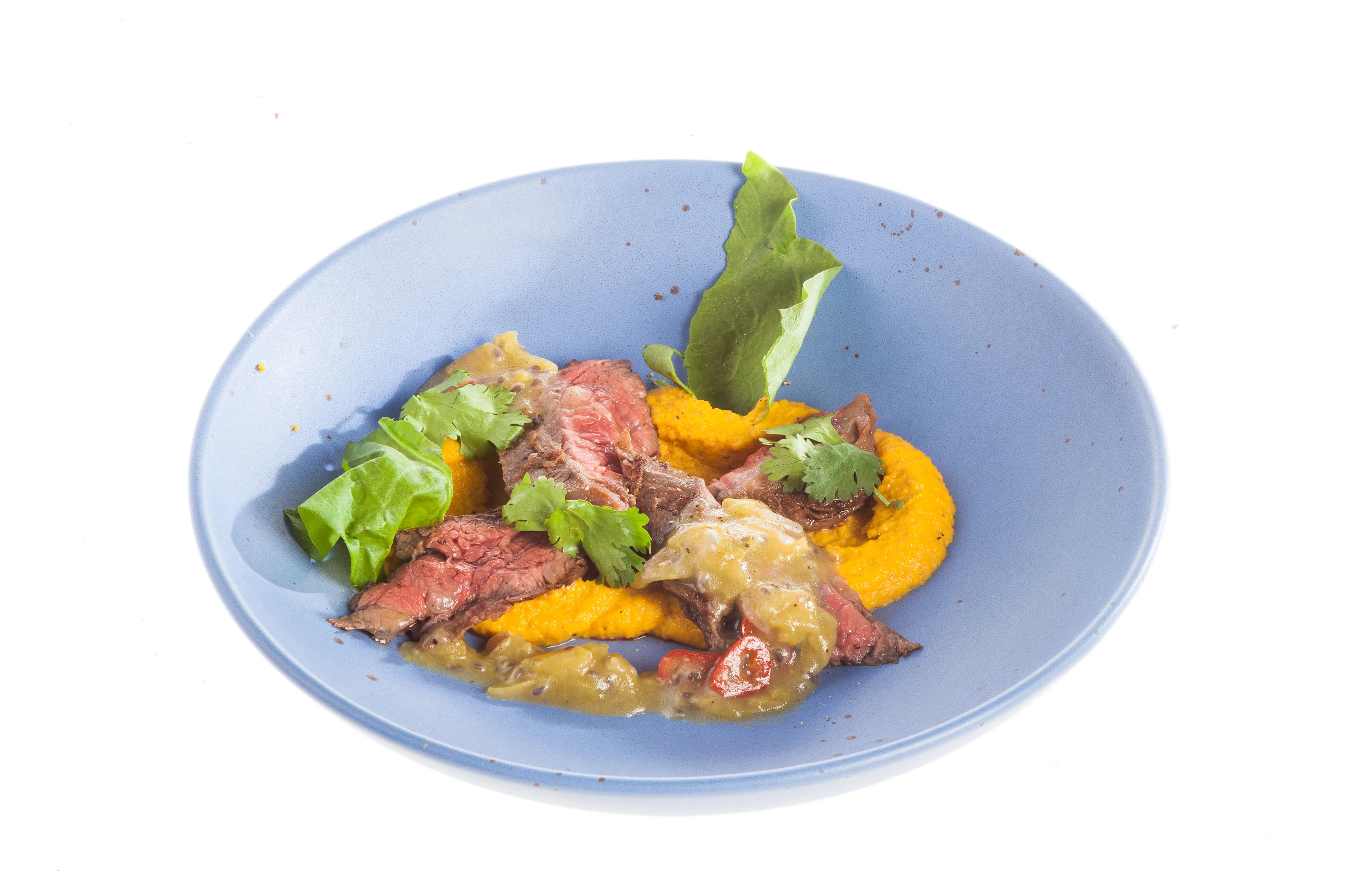 Стейк с морковным пюре и чатни из крыжовника