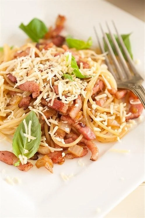ШАГ 5 Добавьте немного воды или вина и подавайте, выложив соус сверху на горячие спагетти. Сверху обильно посыпьте пармезаном и базиликом.