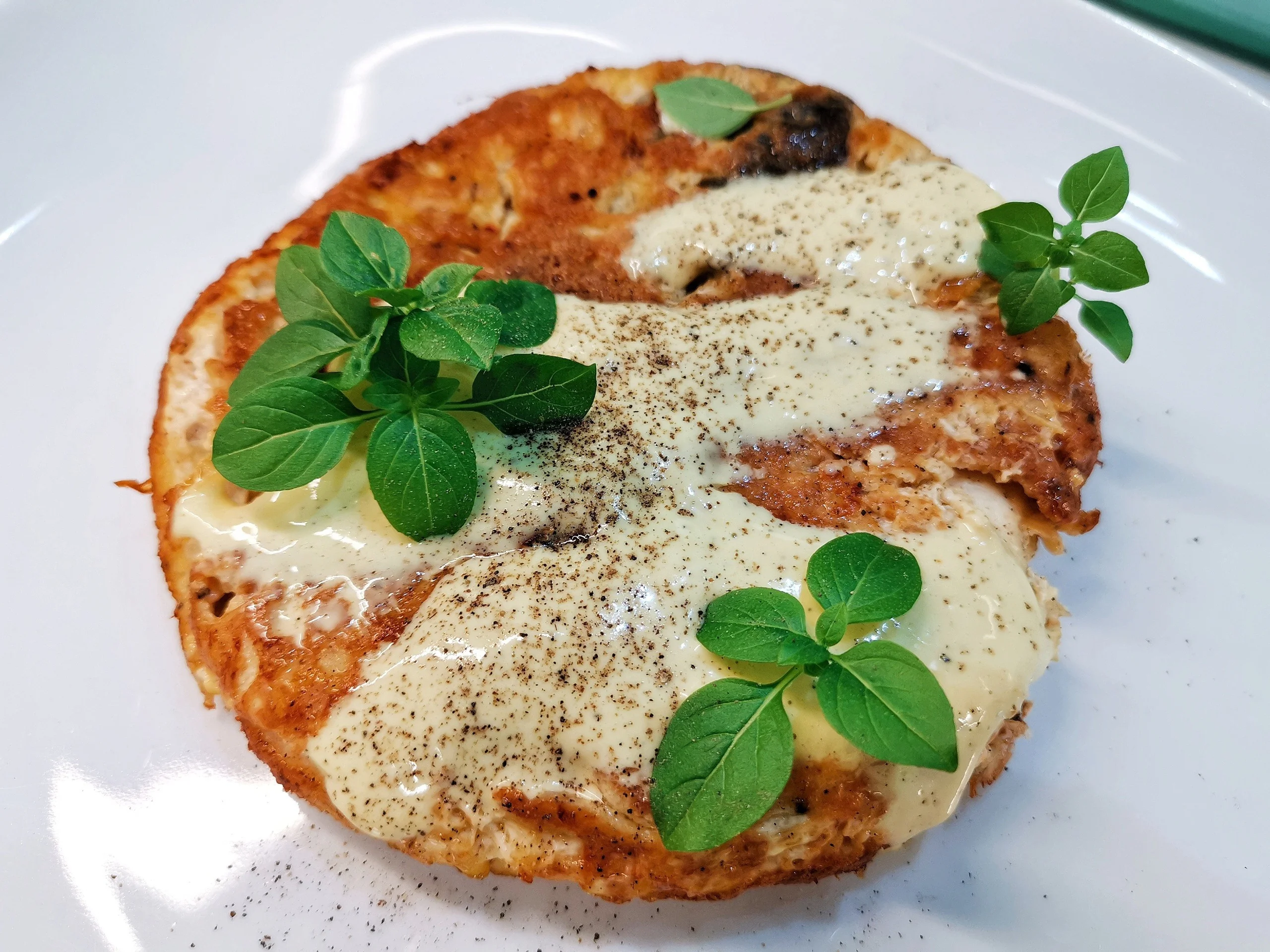 ШАГ 9 Обжаривать еще около 7 минут, затем переложить на блюдо и заправить майонезом. Украсить листьями базилика.