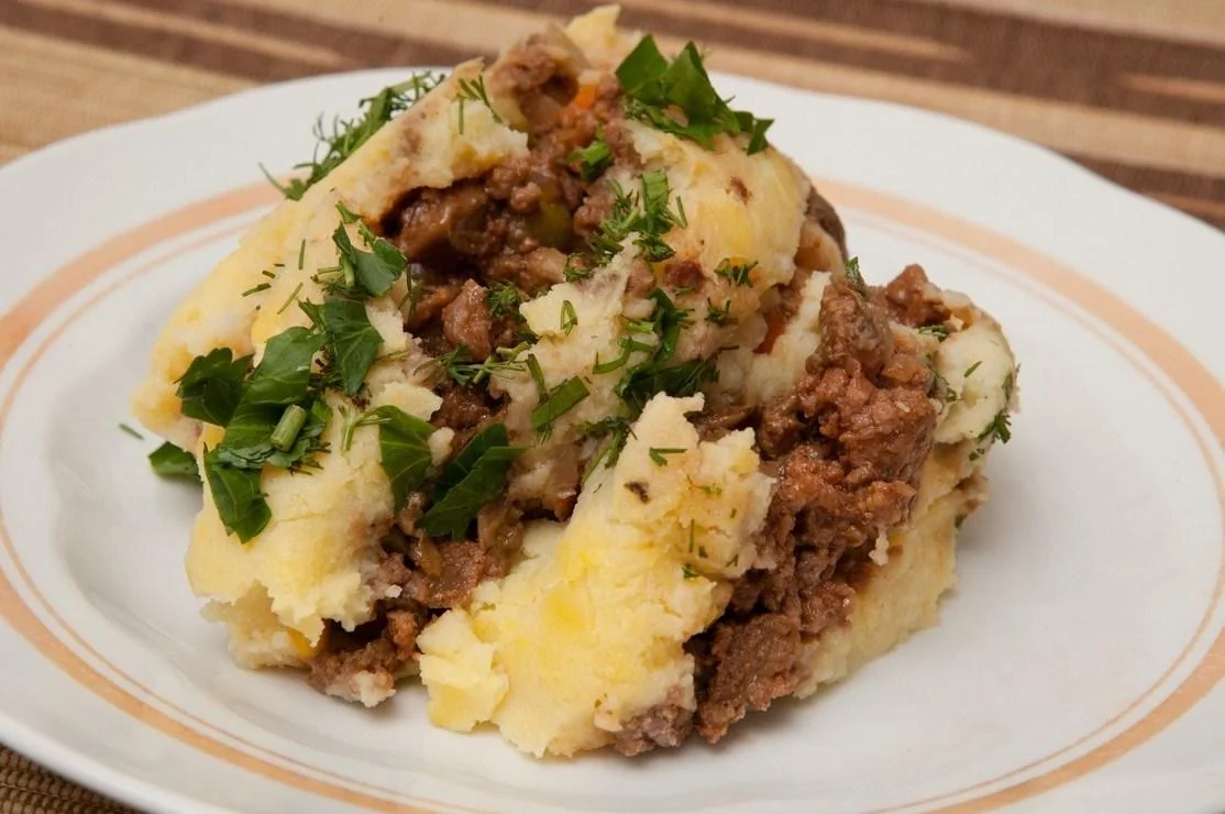 ШАГ 5 В порционные горшочки (6 штук) выложить на дно картофельное пюре и разровнять ложкой. Сверху на пюре равномерно распределить мясной фарш с овощами и накрыть вторым слоем картофельного пюре.